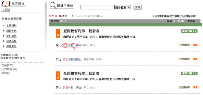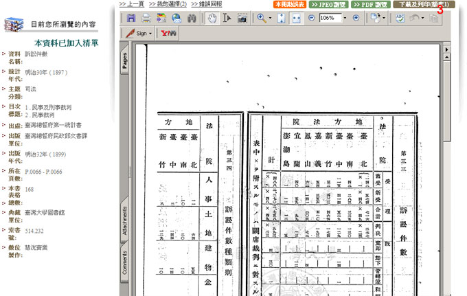 1.在資料檢索結果頁面,按資料名稱如〝訴訟件數〞進入資料暨影像瀏覽頁面。左方為資料區,右方為影像區。左方資料計有資料名稱、統計年代、目次標題、出處、出版單位、出版年代、所在頁數、本書表格總數、典藏單位、索書號、備註、數位製作共12項資料,請參照輸出資料章節。