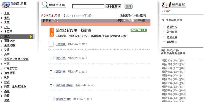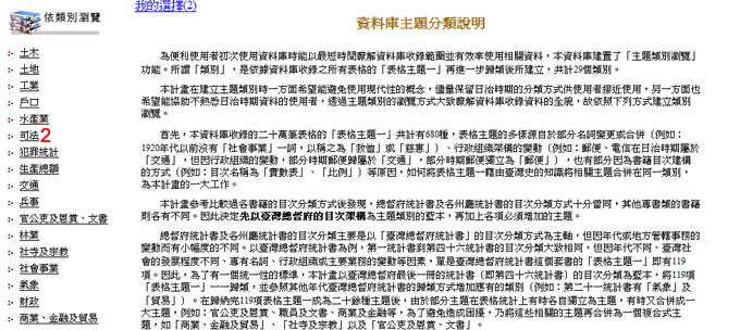 瀏覽主題類別 說明 1.由首頁按《瀏覽》進入,右方為本資料庫主題分類說明,請詳加閱覽以了解本資料庫主題分類架構,本資料庫依照右述的主題歸類方式,共產生29項主題類別如左頁面所示。 2. 直接點選29項主題類別中欲瀏覽主題類別之項目,如 司法。 3. 呈現出〝依所點選之主題類別-司法〞所排序出的資料頁面。