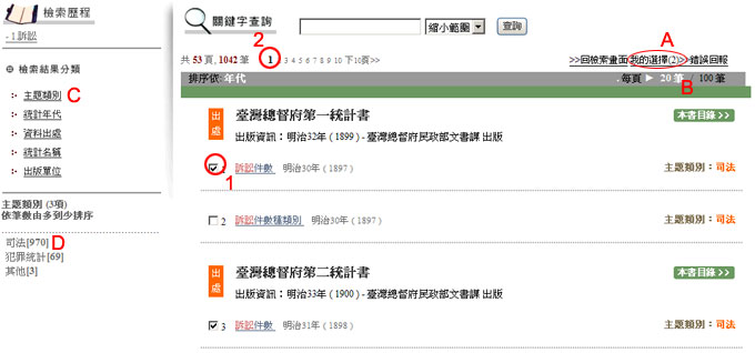 1.在Checkbox勾選不需要的項目。不論是經由檢索所產生查詢出的資料;或由瀏覽主題類別所產生的資料。二者經過複選所產生的資料頁面,可移除不需要的資料,產生新的頁面。複選瀏覽資料的步驟同〝呈現複選的檢索資料〞說明。